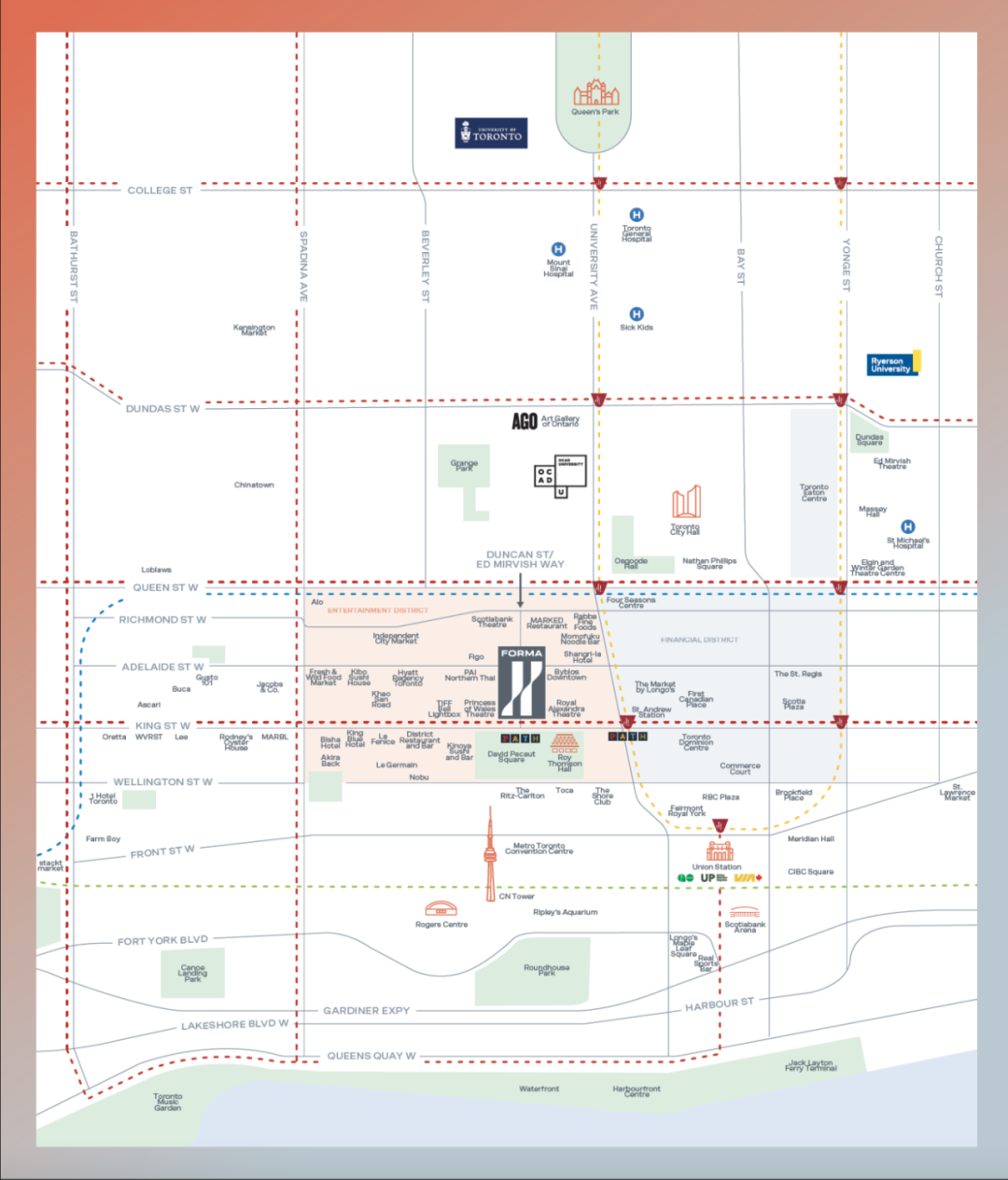 社区将以娱乐、零售和餐饮等令人心动的城市设施为基础,Metro Hall、David Pecaut Square 和 Roy Thomson Hall都在街对面,其中TIFF Bell Lightbox是多伦多国际电影节的总部,它全年放映、举办一流的活动。King West以金融区、娱乐区和剧院区等地标而闻名。Forma Condos的居民可以参观附近的景点,如:罗杰斯中心、加拿大航空中心、里普利水族馆、大量受欢迎的酒吧和美味的餐厅。此外,居民也可以利用这个优越位置周围的世界级交通系统,享受100分满分的完美交通分数。St. Andrew 和 Osgoode TTC地铁站距离即将建成的塔楼仅几步之遥,同时楼盘距离该市一些最受欢迎的学校非常近,该地区的房屋受到多伦多人的广泛追捧,从学生和年轻的专业人士,再到附近金融区工作的高管,甚至年轻的家庭都选择住在该地区。这种自住或投资的机会实属难得!