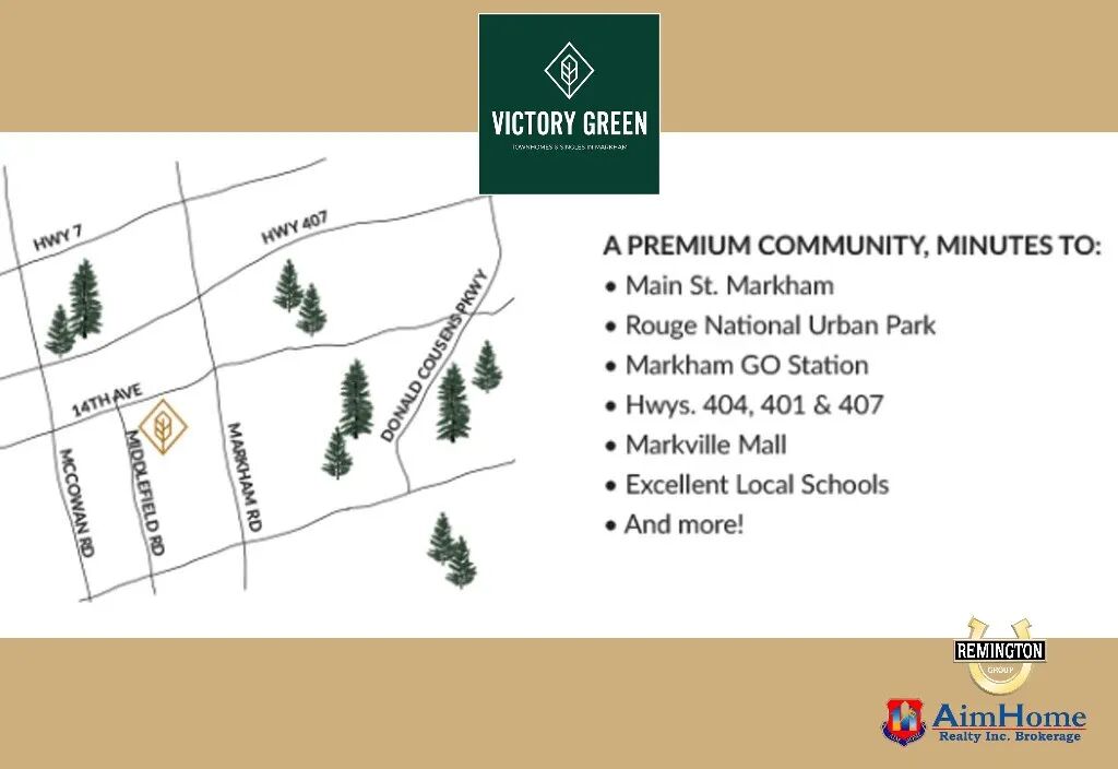 Victory Green由著名开发商Remington 负责开发,位于 万锦区Middlefield Road和14th Avenue 的交界处,附近生活设施一应俱全,公交车站,餐厅,超市,商场,银行,高尔夫俱乐部,中小学校、日托,等等等。。。是一个不可多得的绝佳位置!可以说Victory Green是相当不错的学区房!