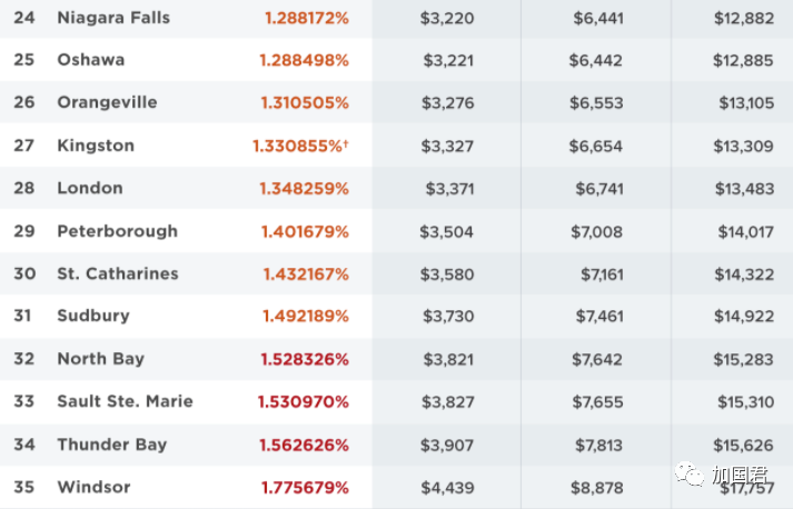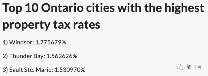 安省地税税率最高的城市是温莎,位于安省南部美加边境,与美国汽车城市底特律遥遥相望,税率高达1.77%。一个估值50万的房子,每年要交给政府的地税高达$8878加元,每月700多加元。