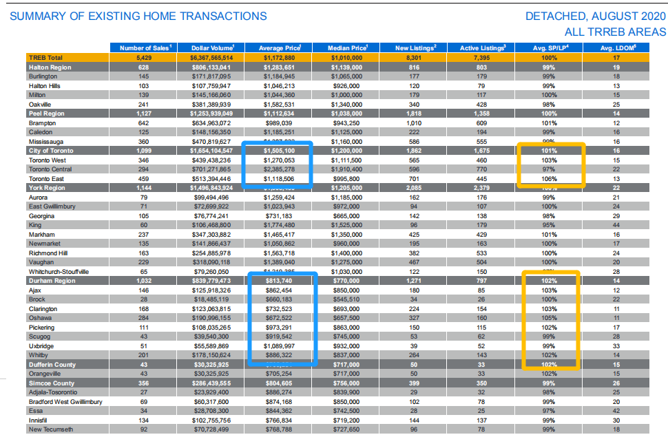 另一个引人注目的地区是多伦多东部的Duhram。这里大部分区域在八月份的销售价格都明显高于叫价。尽管Duhram紧邻多伦多,但是房地产价格依然还有很大增长空间,经过这段时间的涨幅,整体房价依然与多伦多有不小的差距。